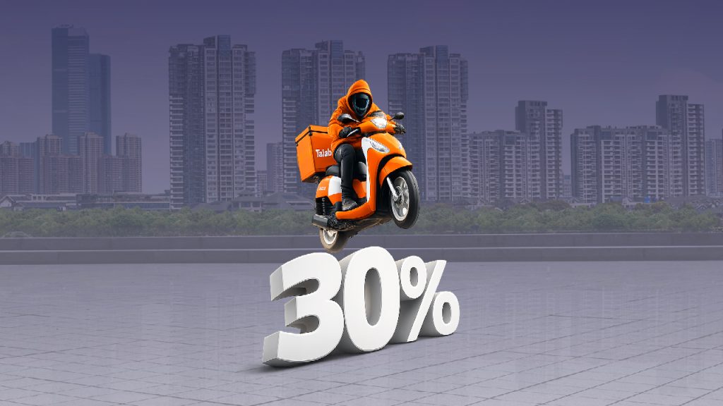 30% of the order net amount made through Talabat’s Platform with a maximum